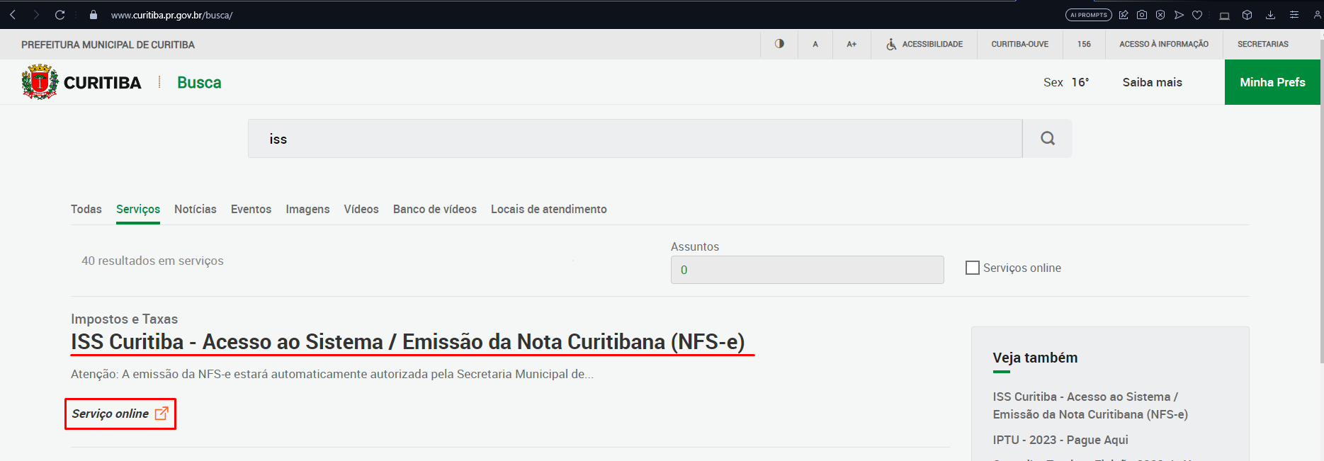 É necessário acessar o link https://www.curitiba.pr.gov.br/busca/?filtro=1&termo=iss e entrar no link de Serviço Online;